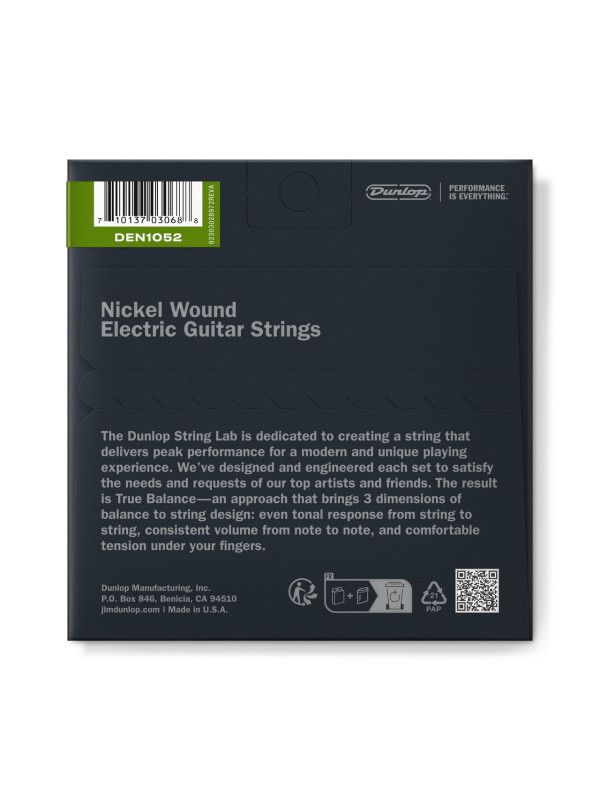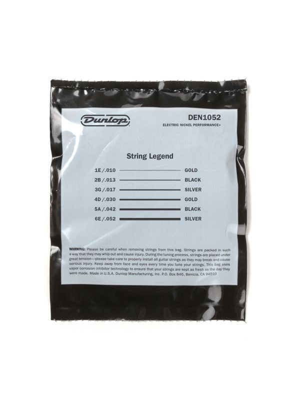 Dunlop DEN1052 10 Light/Heavy 10-52 Nickel Electric Guitar Strings. Manufactured In Dunlop's climate controlled manufacturing facility in Benicia, California USA. Sealed in a VCI fresh technology (vapor corrosion inhibitor) bag. Innovative hybrid wrapping techniques and custom core-to-wrap ratios produce superior low-tension string. Warm, aggressive midrange. Excellent dynamics. Smooth feel. Balanced response!