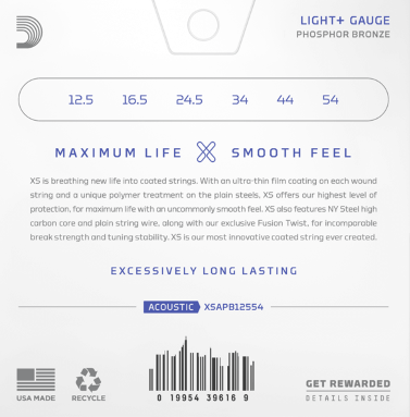 - Born from our greatest breakthrough in string innovation, XS Phosphor Bronze strings have the longest life of any D’Addario acoustic guitar string. The XS coating gives our warm, balanced phosphor bronze strings maximum life, with an uncommonly smooth feel. Made with a NY Steel core, phosphor bronze wrap wire and Fusion Twist technology, XS coated acoustic guitar strings have incomparable break strength and tuning stability, in addition to their dramatically increased lifespan. 12.5 – 54 Light Plus is a perfect combination of Light and Medium gauges, featuring medium tension bottom strings and lighter tension on top.