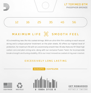 Родени от нашия най-голям пробив в иновациите в струните, струните XS Phosphor Bronze имат най-дълъг живот от всички струни за акустична китара D’Addario. XS покритието осигурява на нашите топли, балансирани струни от фосфорен бронз максимален живот, с необичайно гладко усещане. Изработени с сърцевина от NY Steel, обвита тел от фосфорен бронз и технология Fusion Twist, струните за акустична китара с XS покритие имат несравнима якост на скъсване и стабилност на настройката, в допълнение към драстично увеличения си живот. Този комплект китара с размер 12-56 Light Top/Medium Bottom има мощни ниски честоти, като същевременно запазва гъвкавост за соло свирене.