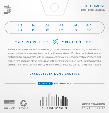 Струните XS Phosphor Bronze имат най-дълъг живот от всички акустични струни D’Addario, благодарение на ултратънкото XS филмово покритие.