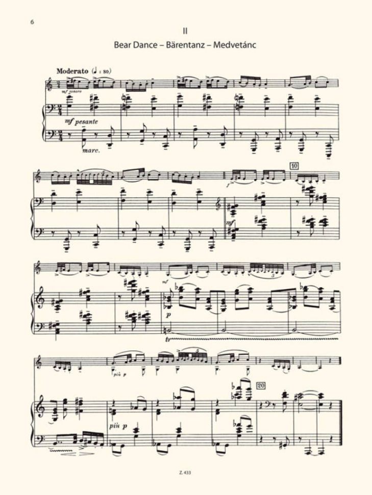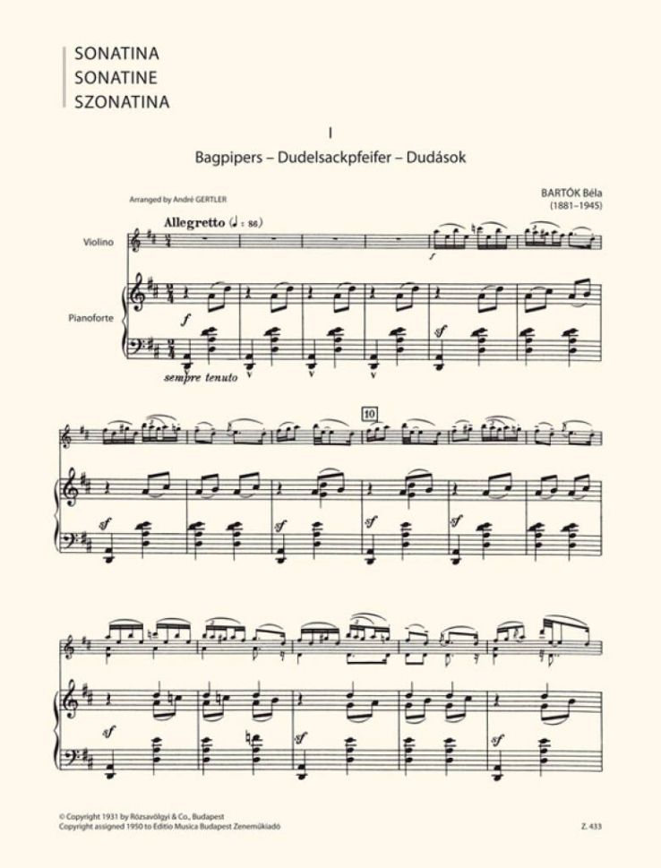 Béla Bartók often used musical material from his folk music collections for his compositions. His Sonatina, originally written for solo piano in 1915, was based on songs that he collected in Transylvania. The three movements (1. Bagpipers. Molto moderato, 2. Bear Dance. Moderato, and 3. Finale. Allegro vivace) were orchestrated by Bartók in 1931. Shortly before Bartók's orchestral transcription was finished, violinist Gertler Endre's transcript for violin and piano was completed. Gertler and Bartók knew each other personally and, in fact, first made each other's acquaintance as a result of their shared experience with their respective transcriptions.