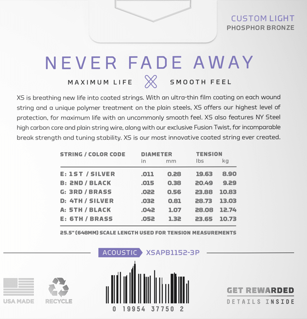 Този комплект XS Phosphor Bronze се предлага с код върху рециклируемата, многократно затваряща се VCI торбичка, която можете да регистрирате, за да печелите точки от Players Circle.