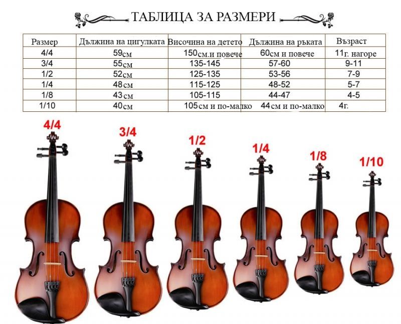 - включва лък с натурални косми, калъф, струни, магаренце и колофон